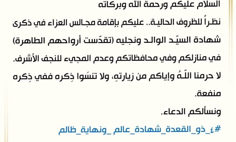 كما دعا إلى الاكتفاء بإقامة المجالس في البيوت والمناطق المحلية، سائلاً الدعاء، ومؤكداً على استمرار إحياء ذكرى الشهيد بما يعكس قيمها ومعانيها.